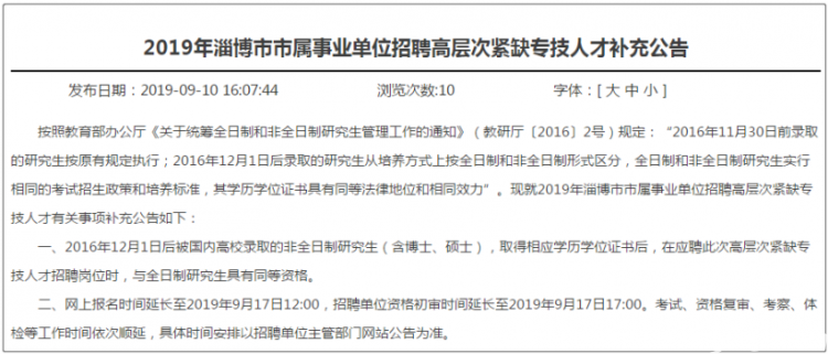 同年9月份,山東淄博市市屬事業(yè)單位招聘高層次緊缺專技人才補充公告中提到,2016年12月1日后被國內(nèi)高校錄取的非全日制研究生(含博士、碩士),取得相應(yīng)學(xué)歷學(xué)位證書后,在應(yīng)聘此次高層次緊缺專技人才招聘崗位時,與全日制研究生具有同等資格。